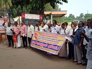 போக்குவரத்து தொழிலாளர்களின் 14 வது ஊதிய ஒப்பந்தம் உடனே பேசி முடிக்க வேண்டும் உள்ளிட்ட கோரிக்கைகளை தமிழக அரசை வலியுறுத்தி ஏஐடியூசி சார்பில் ஆர்ப்பாட்டம் தஞ்சை, அரசு போக்குவரத்து கழக பணிமனையில் முன்பு நடைபெற்றது. தமிழ்நாடு அரசு போக்குவரத்துக் கழகங்களில் சுமார் ஒரு லட்சத்து 30 ஆயிரம் பேர் பணிபுரிகிறார்கள். இவர்களுக்கு 2019 செப்டம்பர் மாதம் ஊதிய ஒப்பந்தம் பேசி முடித்து சம்பள உயர்வு ஏற்படுத்தப்பட்டு இருக்க வேண்டும். ஆனால் இதுவரை பேசி முடிக்கப் படாமல் உள்ளது. அடுத்த ஒப்பந்தம் நெருங்கி விட்ட நிலையில் 14 வது ஊதிய ஒப்பந்தம் பேசி முடித்து சம்பள உயர்வு ஏற்படுத்தப்பட வேண்டும்.