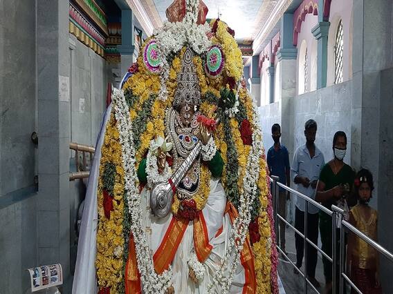 சரஸ்வதி அம்மனின் உற்சவமூர்த்தி சிலைக்கு வெண்பட்டு உடுத்தி அலங்காரம் செய்யப்பட்டு காட்சி அளிக்கப்பட்டது. இன்றைய தினமும் வெண்பட்டு உடுத்தப்பட்டு வெண் தாமரை மலர்களை சரஸ்வதி அம்மனுக்கு காணிக்கையாக ஏராளமான பக்தர்கள் வழிபாடு நடத்தி வருகின்றனர். தமிழகம் மட்டுமின்றி பல்வேறு மாநிலங்களில் இருந்தும் ஏராளமான பக்தர்கள் வருகை தந்துள்ளனர். கொரோனா தொற்று காரணமாக வெள்ளி, சனி, ஞாயிற்று கிழமைகளில் கோயில்கள் மூடப்பட்டிருக்கும் என்றும் பக்தர்களுக்கு அனுமதி இல்லை என்றும் தமிழ்நாடு அரசு முன்னர் அறிவித்திருந்தது.