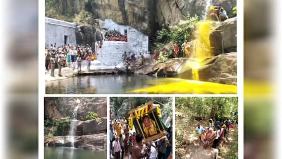 மஞ்சளாக கொட்டிய அருவி நீரில் செண்பகாதேவி அம்மனுக்கு நடைபெற்ற தீர்த்தவாரி நிகழ்ச்சி - ஏராளமான பக்தர்கள் பங்கேற்பு.