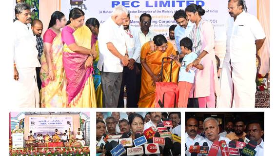 ஆர்இசி லிமிடெட் சமூக பொறுப்பு நிதியில் இருந்து மாற்றுத்திறனாளிகளுக்கான உதவி உபகரணங்கள் வழங்கும் முகாம் தூத்துக்குடி வ.உ.சி. கல்லூரி கலையரங்கத்தில் நடைபெற்றது.. இந்த விழாவில், தூத்துக்குடி மாவட்ட பாராளுமன்ற உறுப்பினர் கனிமொழி கருணாநிதி, ஆர்இசி லிமிடெட் இயக்குனர் திருப்பதி நாராயணன், அமைச்சர் கீதாஜீவன், ஆட்சியர் லட்சுமிபதி, மேயர் ஜெகன்பெரியசாமி, சண்முகையா எம்எல்ஏ ஆகியோர் கலந்து கொண்டு, குத்துவிளக்கேற்றி மாற்றுத்திறனாளிகளுக்கான உதவி உபகரணங்களை வழங்கி முகாமினை தொடங்கி வைத்தனர். பின்னர், மாற்றுத்திறனாளிகளுக்கான உதவி உபகரணங்கள் வழங்கப்பட்டது.