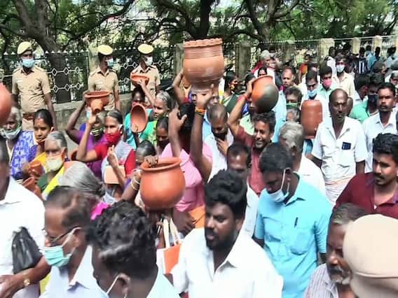 மண்பாண்ட பொருட்கள் செய்வதற்கு ஆண்டுக்கு 80 யூனிட் மணல் இலவசமாக எடுக்க தமிழக அரசு அனுமதி அளித்து அரசாணை வெளியிட்டுள்ளது. அதன் அடிப்படையில் கடந்த சில ஆண்டுகளாக மண்பாண்ட தொழிலாளர்கள் இலவசமாக மண்ணெடுத்து மண்பானைகள், அகல் விளக்குகள், உண்டியல், அடுப்பு, தெய்வத் திருவுருவங்கள், பொம்மைகள் போன்ற மண்பாண்ட பொருட்கள் செய்து அதன் மூலம் கிடைக்கின்ற வருமானம் மூலம் தங்களது வாழ்வாதாரத்தை மேம்படுத்த வருகின்றனர். இந்த சூழலில் நெல்லை ஆட்சியர் அலுவலகத்திற்கு தங்களது கோரிக்கையை வலியுறுத்தி மண் பண்டங்களை எடுத்துக் கொண்டு மனு அளிக்க வந்தனர். அப்போது அவர்கள் கூறும் பொழுது,