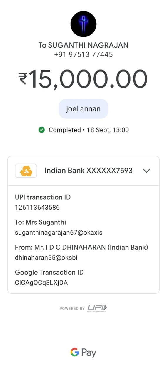 நீங்கள் அனுப்பும் 15,000 ரூபாய், ஒருநாள் தனது குழந்தையின் உயிரைக் காக்கும் என்று குறுஞ்செய்தியை பார்த்து இறக்கப்பட்ட ஜோயல் தனது உதவியாளர் விஜயகுமாரிடம் சொல்ல, அவர் தூத்துக்குடியில் உள்ள ஜோயலின் உதவியாளர் தினகரனிடம் பணம் அனுப்ப சொல்லியதை தொடர்ந்து தினகரும் அந்த நபரின் எண்ணுக்கு (9751377445) இந்த எண்ணுக்கு கூகுள் பே மூலம் 15 ஆயிரம் ரூபாய் அனுப்பி உள்ளார். சில நாட்கள் கழித்து அதே குறுஞ்செய்தி சமூக வலைதளங்களில் பரவி, அவரிடமே மீண்டும் இந்த குறுஞ்செய்தி வந்ததைப் பார்த்து அந்த எண்ணில் விசாரித்தபோது அந்த நபர் மீது சந்தேகம் ஏற்பட்டுள்ளது.