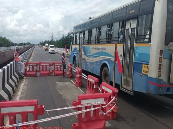 இந்நிலையில் வாகனங்கள் சென்று வரும் இந்த ஒருவழிப் பாதை பகுதியில் மீண்டும் சேதம் ஏற்பட்டது. பாலத்தில் திடீர் ஓட்டை விழுந்ததால் வாகன ஓட்டிகள் அச்சமடைந்தனர். தகவல் அறிந்ததும் தேசிய நெடுஞ்சாலைத்துறை அதிகாரிகள் விரைந்து வந்து சேதமடைந்த பகுதியை சீரமைக்கும் பணியில் ஈடுபட்டனர். அந்த பகுதியில் சாலை தடுப்புகளை போட்டு சீரமைக்கும் பணிகள் நடைபெற்று வருகின்றது. இதனால் அந்த பகுதியில் போக்குவரத்து நெருக்கடி ஏற்பட்டு வாகன ஓட்டுநர்கள் சிரமமடைந்து வருகின்றனர்.