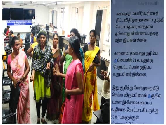 இந்நிலையில் நெல்லை மாவட்டம் சுத்தமல்லி பகுதியைச் சேர்ந்த திருநங்கைகள் தங்களுக்கு கலைஞர் உரிமைத்தொகை வரவில்லை என்று நெல்லை ஆட்சியர் அலுவலகத்தில் உள்ள தாலுகா அலுவலகத்தில் உள்ள இ சேவை மையத்தில் குவியத் தொடங்கினர். அப்போது அவர்கள் எங்களுக்கு வந்த குறுஞ்செய்தியில் உங்கள் குடும்ப அட்டையில் 21 வயசு நிரம்பிய பெண் இல்லை என வந்துள்ளது என கூறி அதிகாரிகளிடம் தங்களது ஆதங்கத்தை தெரிவித்தனர். இது குறித்து திருநங்கை சாம்பவி என்பவர் கூறும் பொழுது, திருநங்கைகளுக்கும் மகளிர் உதவித்தொகை உண்டு என முதல்வர் அறிவித்திருந்தார்.. அதன்பேரில் நாங்கள் விண்ணப்பித்திருந்தோம்.. எங்கள் பகுதியில் மட்டும் 60 திருநங்கைகள் உள்ளனர். எங்களுக்கு வந்த குறுஞ்செய்தியில் 21 வயதிற்கு மேற்பட்ட பெண்கள் இல்லை என வந்துள்ளது. தமிழக அரசு எங்களுக்கு அதிகமான உதவிகள் செய்துள்ளது. அதனால் மிகுந்த மகிழ்ச்சி அடைந்தோம். ஆனால் எங்களை பெண்ணே இல்லை என அரசாங்கமே புறக்கணித்து செய்தி அனுப்பியுள்ளது.. அப்படியென்றால் மக்கள் எந்த விதத்தில் எங்களை பார்ப்பார்கள் என மனவேதனையில் உள்ளோம் என்று தெரிவித்தனர்.