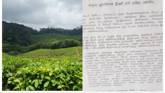 மாஞ்சோலை தேயிலைத் தோட்ட தொழிலாளர்களுக்கு தனியார் தேயிலைத்தோட்ட நிர்வாகமான பிபிடிசி விருப்ப ஓய்விற்கான இறுதி நாள் குறித்த நான்காவது நோட்டீசை இன்று வழங்கியுள்ளது. அதில் தொழிலாளர்கள் விண்ணப்பம் செய்வதற்கான விண்ணப்பத்தை பிபிடிசி கம்பெனி வழங்கிக் கொண்டிருக்கிறது. அதனை தொழிலாளர்கள் பெற்று சமர்பிப்பதற்கான கடைசி நாள் 14.06.24 என்பது அறிவிக்கப்படுகிறது. விருப்ப ஓய்வு திட்டம் மற்றும் தீர்வு ஒப்பந்தத்தின்படி இறுதி நாள் 15.06.24 என்பது இதன் மூலம் அறிவிக்கப்படுகிறது. மேலும் விருப்ப ஓய்வு விண்ணப்பித்த தொழிலாளர்கள் தங்களது பணியிலிருந்து ஓய்வு பெறுகின்ற நாளையும் மற்றும் அந்நாளில் நிர்வாகத்தின் தொழிலாளர்கள் என்பதிலிருந்து விடுவிக்கப்படுவதாகும் என குறிப்பிடப்பட்டுள்ளது.
