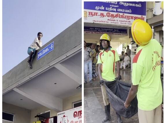 அதற்கு அவர் மறுப்பு தெரிவித்ததோடு தனது காண்ட்ராக்டர் காளி என்பவர் தனக்கு சம்பள பாக்கி 3000 ரூபாய் தர வேண்டும் எனவும் அதனை தந்தால் தான் கீழே வர முடியும் என மிரட்டல் விடுத்துக் கொண்டே இருந்தார்.. காவல்துறையினர் மாடிக்கு சென்று அவரை மீட்க நினைக்கும் போது அவர் அங்கிருந்து கீழே குதித்தார். அப்போது தீயணைப்பு துறையினர் கீழே துணியை விரித்து அவரை மீட்க தயாராக இருந்த நிலையில் அவர் கீழே குதித்தார். அப்போது தீயணைப்பு துறையினர் அவரை கீழே விரித்து வைத்திருந்த துணியின் மூலம் மீட்டனர். இதில் அவருக்கு லேசான மயக்கம் ஏற்பட்டது. சிறிது நேரத்திற்கு பின்னர் அவரை புறக்காவல் நிலையத்திற்கு அழைத்து சென்று விசாரணை செய்து வருகின்றனர்.. இதனால் அந்த பகுதியில் சுமார் அரை மணி நேரம் பரபரப்பான சூழ்நிலை காணப்பட்டது..