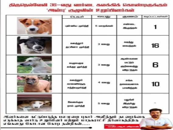 குறிப்பாக நெல்லை மாநகரப் பகுதியில் நாய்கள் தொல்லை கடந்த சில மாதங்களாக அதிகரித்து காணப்படுகிறது. நெல்லை சந்திப்பு, மேலப்பாளையம், டவுண், பாளையங்கோட்டை போன்ற பகுதிகளில் நாய்கள் தொல்லையால் மக்கள் நாள்தோறும் அவதிப்பட்டு வருவதாக கூறப்படுகிறது. இதனால் வெறி நாய்கள் கடித்து பலர் பாதிக்கப்பட்டு வருவதாகவும் கூறப்படுகிறது. இது போன்ற சூழ்நிலையில் நெல்லை 36வது வார்டில் நாய் தொல்லையை கட்டுப்படுத்தாத மாநகராட்சியை கண்டிக்கும் வகையில் சமூக ஆர்வலர் சிராஜ் என்பவர் நகைச்சுவையாக சுவரொட்டி ஒன்றை அப்பகுதியில் ஒட்டியுள்ளார். அதில் 36 வது வார்டை கலக்கிக் கொண்டிருக்கும் அன்பு குழுவின் உறுப்பினர்கள் என்ற தலைப்பை வைத்து ஆரம்பித்துள்ளார். அதன் கீழ் வரிசையாக விதவிதமாக நாய்களின் புகைப்படங்களோடு அவற்றின் பெயர், வயது, குணம் மற்றும் அந்த நாய்களால் கடிப்பட்டவர்களின் எண்ணிக்கையை கற்பனையோடு பதிவிட்டுள்ளார். குறிப்பாக புண்ணியமூர்த்தி, கலத்தூர் தட்சிணாமூர்த்தி, வழுவக்குடி சுந்தரமூர்த்தி, கலத்தூர் காலனிதெரு சத்திய மூர்த்தி, வேலக்குடி ராமமூர்த்தி என்று நாய்களுக்கு கலக்கலான பெயர்களையும் சூட்டியுள்ளார்.
