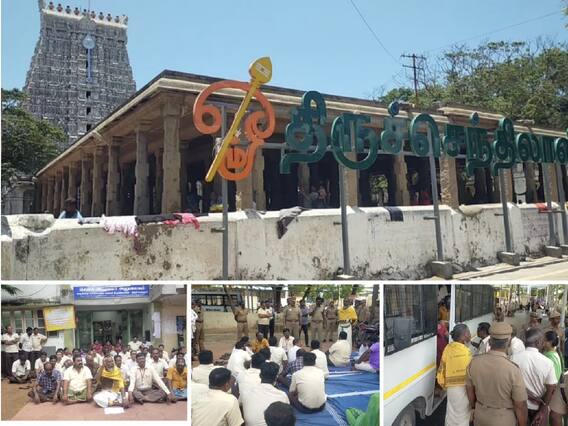 திருச்செந்தூர் சுப்பிரமணிய சுவாமி கோயில் 6 பணியாளர்கள் பணியிட மாற்றம் செய்யப்பட்டதை கண்டித்து பணியாளர்கள் பணியை புறக்கணித்து திடீர் போராட்டத்தில் ஈடுபட்டனர். அனுமதியின்றி போராட்டம் நடத்தியதாக 6 பெண்கள் உட்பட 41 பணியாளர்களை போலீசார் கைது செய்தனர்.