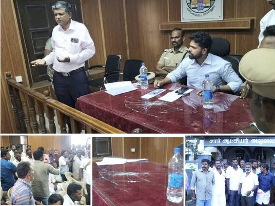 சார் ஆட்சியர் தலைமையில் உடன்பாடு கூட்டம் நடந்து கொண்டு இருக்கும் போதே விசைப்படகு உரிமையாளர்கள் மற்றும் தொழிலாளர் சங்கத்தினருக்கு இடையே வார்த்தை போர் துவங்க ஒரு கட்டத்தில் கூச்சல் அதிகமாக அதிகமாக போலீசார் கூட்டத்தை அமைதிப்படுத்த முயன்றனர். எதற்கும் செவி சாய்க்காமல் வார்த்தை போர் அதிகமானதால் சார் ஆட்சியர் கெளரவ்குமார், டென்சனில் மேஜை மீது ரெண்டு தட்டுத்தட்ட மேஜை மீது போடப்பட்டு இருந்த கண்ணாடி சல்லி சல்லியாக நொறுங்கியது. இதனால் கூட்டத்தில் கலந்து கொண்டோர் திகைக்க , பேச்சுவார்த்தை முடிவு பெறாமல் கலைந்து சென்றனர்.இது குறித்து மீனவர்கள் கூறுகையில்,சப் கலெக்டர் கூட்டத்தை சமாதனப்படுத்துவார்,உடன்பாடு ஏற்படும் நினச்சி வந்தால் கோபத்தில் கண்ணாடிய உடச்சிட்டாரே என புலம்பியபடி சென்றனர்.
