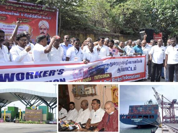 தூத்துக்குடி பழைய துறைமுகம் முன்பு துறைமுக தொழிலாளர் ஊதிய உயர்வு ஒப்பந்தத்தை உடனடியாக ஏற்படுத்த வேண்டும், இரண்டு ஆண்டுகள் நிலுவையில் உள்ள போனஸ் பிரச்சனையை பேசி தீர்க்க வேண்டும், துறைமுகத்தின் காலிப் பணியிடங்களை நிரப்ப வேண்டும், துறைமுக சொத்துக்களை தனியாருக்கு விற்பனை செய்வதை கைவிட வேண்டும் என்பது உள்ளிட்ட கோரிக்கைகளை வலியுறுத்தி வ.உ.சி. துறைமுக லேபர் டிரஸ்டி பாலகிருஷ்ணன் தலைமையில் ஆர்ப்பாட்டம் நடந்தது.