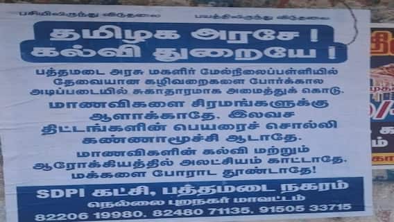 இந்நிலையில் இந்த அரசு பள்ளிக்கு எதிரில் தமிழக அரசை கண்டித்து எஸ்டிபிஐ கட்சி தரப்பில் வால் போஸ்டர் ஒன்று ஒட்டப்பட்டுள்ளது. அதில் தமிழக அரசே! கல்வித்துறையே! பத்தமடை அரசு மகளிர் மேல்நிலைப்பள்ளியில் தேவையான கழிவறைகளை போர்க்கால அடிப்படையில் சுகாதாரமாக அமைத்துக்கொடு, மாணவிகளை சிரமங்களுக்கு ஆளாக்காதே, இலவச திட்டங்களின் பெயரைச் சொல்லி கண்ணாமூச்சி ஆடாதே! மாணவிகளின் கல்வி மற்றும் ஆரோக்கியத்தில் அலட்சியம் காட்டாதே, மக்களை போராட தூண்டாதே! என்று குறிப்பிடப்பட்டுள்ளது. பள்ளியின் அருகே எஸ்டிபிஐ சார்பில் ஒட்டப்பட்டுள்ள போஸ்டர் விவகாரம் பெரும் சர்ச்சையையும், பரபரப்பையும் ஏற்படுத்தி உள்ளது.