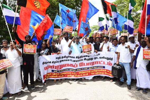 தமிழ்நாட்டை நம்பி வந்த தொப்புள் கொடி உறவுகள் மீதான அடக்குமுறையை நிறுத்திட வேண்டும் என்பது உள்ளிட்ட கோரிக்கைகளை வலியுறுத்தி மே 17 இயக்கம், விடுதலை தமிழ் புலிகள் கட்சி, தமிழக மக்கள் ஜனநாயக கட்சி, தமிழ் புலிகள் கட்சி, தமிழர் விடியல் கட்சி உள்ளிட்ட பல்வேறு அமைப்புகள் சார்பில் திருச்சி மத்திய சிறை வளாகத்தில் உள்ள சிறப்பு முகாமை முற்றுகையிட்டு இன்று போராட்டம் நடத்தப்பட்டது.