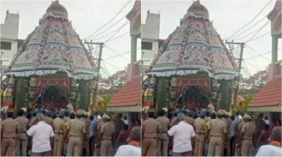திருச்சி மாவட்டம் லால்குடியை அடுத்த ரெட்டிமாங்குடி கிராமத்தில் உள்ள செல்லியம்மன் கோவிலில் திருவிழா நடைபெற்று வருகிறது. இதையொட்டி கடந்த 5-ந் தேதி காப்புக்கட்டப்பட்டது. 6-ந் தேதி முதல் 11-ந் தேதி வரை இரவில் மண்டகப்படி நிகழ்ச்சிகள் நடந்தன. நேற்று முன்தினம் பொங்கல் வைத்து, இரவில் குதிரை வாகனத்தில் செல்லியம்மன் வீதி உலா நடைபெற்றது. இதைத்தொடர்ந்து தேரோட்டம் நடைபெற்றது. இதில் காலை 11.30 மணிக்கு தேர் புறப்பாடும், கிடா வெட்டுதலும் நடைபெற்றது. இதைத்தொடர்ந்து செல்லியம்மன் கோவிலில் இருந்து அனைத்து தரப்பு பக்தர்களும் தேரை வடம் பிடித்து பொதுச்சாவடி வரை இழுத்தனர். பின்னர் பொதுச்சாவடியில் இருந்து ஒரு சமூகத்தை சேர்ந்த மண்டி வரை அந்த சமூகத்தை சேர்ந்த மக்கள் மட்டும் தேரை வடம் பிடித்து இழுத்துச் சென்று, மீண்டும் பொதுச்சாவடிக்கு தேரை இழுத்து வந்தனர். பின்னர் பொதுச்சாவடியில் இருந்து முருகன் கோவில் வரை மற்றொரு சமூகத்தை சேர்ந்த மக்கள் தேரை வடம்பிடித்து இழுத்து வந்தனர். வேறொரு சமூகத்தை சேர்ந்த மக்களின் மண்டிக்கு 20 மீட்டர் தூரத்தில் தேர் இழுத்துவரப்பட்டபோது, அங்கிருந்து மண்டி வரை அந்த சமூகத்தை சேர்ந்த மக்கள் தேரை இழுத்துச்செல்ல முயன்றனர். ஆனால் அவர்கள் தேரை இழுத்துச்செல்ல, ஏற்கனவே தேரை இழுத்து வந்த மக்கள் எதிர்ப்பு தெரிவித்தனர். இதனால் இரு தரப்பினருக்கும் இடையே வாக்குவாதம் ஏற்பட்டது. மேலும் இந்த பிரச்சினையால் தேர் நடுவழியில் நிறுத்தப்பட்டது.