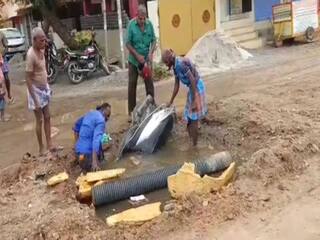 திருச்சி மாநகராட்சியில் உள்ள 65 வார்டுகளில் பாதாள சாக்கடை மற்றும் வீடுகளுக்கு குடிநீர் குழாய் பொருத்தும் திட்டம் தார் சாலை மற்றும் கான்கீரிட் சாலை அமைக்கும் திட்டம் செயல்படுத்தப்பட்டு வருகிறது. இதற்காக முக்கிய சாலைகளில் ஆங்காங்கே பள்ளங்கள் தோண்டப்பட்டு இந்த பணிகள் நடைபெற்று வருகிறது. இந்த நிலையில் திருச்சியில் நாள்தோறும் வெயில் சுட்டெடுத்து வந்தாலும் அவ்வப்போது இரவு நேரங்களில் மழை பெய்து மக்களை மகிழ்ச்சி அடைய செய்கிறது. இந்த நிலையில் பாதாள சாக்கடை மற்றும் குடிநீர் திட்டத்திற்காக தோண்டப்பட்ட பள்ளங்கள் மழை நீர் தேங்கி நிற்பதால் வாகன ஓட்டுகளும் பாதசாரிகளும் பெரும் சிரமத்திற்கு ஆளாகி வருகின்றனர் அவ்வபோது வாகனங்கள், பேருந்துகள் லாரிகள், கனரக வாகனங்கள் சாலையில் தோண்ட பள்ளத்தில் சிக்கி கொள்வது தொடர் கதையாகி இருந்து வருகிறது இது மட்டுமின்றி இரு சக்கர வாகனத்தில் செல்வோர்கள் நிலை தடுமாறி அந்த பள்ளத்தில் விழுந்து காயம் ஏற்படும் சம்பவம் வாடிக்கையாக இருந்து வருகிறது. இது போல திருச்சி தென்னூர் அண்ணாநகர் பகுதியில் உள்ள வீரமாமுனிவர் தெரு முனையில் சாலை மற்றும் பாதாள சாக்கடை பணிக்காக தோண்டப்பட்ட பள்ளத்தில் வாகன ஓட்டி ஒருவர் நிலை தடுமாறி விழுந்து விட்டார். உடனடியாக நேரில் பார்த்த அக்கம் பக்கத்தினர் அவரையும் அவரது வாகனத்தையும் மீட்டனர்.