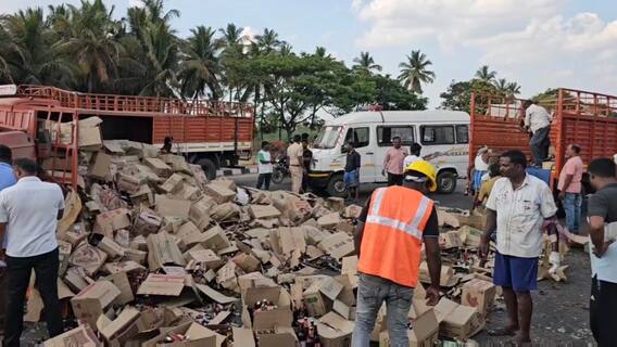 திருப்பத்தூரில் அரசு டாஸ்மாக் மதுபானங்களை ஏற்றி சென்ற சரக்கு லாரி சாலையில் கவிழ்ந்த விபத்தில் தேசிய நெடுஞ்சாலையில் மது பாட்டில்கள் சிதறியது. பாட்டில்களை அள்ளிச் சென்ற பொது மக்களை தடுத்து காவல்துறையினர் பாதுகாப்பு பணியில் ஈடுபட்டு வருகின்றனர். இந்த சம்பவத்தால் சென்னை - பெங்களூர் தேசிய நெடுஞ்சாலையில் போக்குவரத்து பாதிப்பு ஏற்பட்டது.
