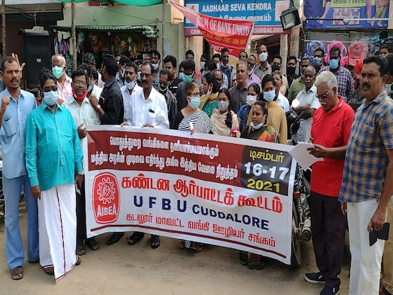தமிழகத்தில் பல்வேறு பகுதிகளில் வேலைநிறுத்த போராட்டம் நடைபெற்று வரும் இந்த நிலையில் கடலூர் பாரதி சாலையில் உள்ள சென்ட்ரல் பேங்க் ஆப் இந்தியா எதிரே வங்கி ஊழியர்கள் அதிகாரிகள் சங்கங்களின் கூட்டமைப்பு சார்பில் சுமார் 50க்கும் மேற்பட்ட வங்கி ஊழியர்கள் மற்றும் அதிகாரிகள் ஆர்ப்பாட்டத்தில் ஈடுபட்டனர், அரசு பொதுத்துறை வங்கிகளை தனியாருக்கு தாரை வார்க்கும் முயற்சியை மத்திய அரசு கைவிட வேண்டும் என கோஷங்கள் எழுப்பப்பட்டது.கடலூர் மாவட்டத்தில் சுமார் 190 க்கும் மேற்பட்ட வங்கி கிளைகளில் இருந்து ஊழியர் அதிகாரிகள் என மொத்தம் சுமார் 750 பேர் வேலை நிறுத்தத்தில் பங்கேற்கின்றனர் இந்த ஆர்ப்பாட்டம் நடைபெறுவதால் மாவட்டத்தில் வங்கி சேவை முடங்கி உள்ளது. மேலும் அது மட்டும் இன்றி கடலூர் மாவட்டத்தில் இரண்டு நாளில் சுமார் 500 கோடிக்கும் மேல் பண பரிவர்த்தனை காசோலை பரிவர்த்தனை பாதிக்கப்பட வாய்ப்பு உள்ளது எனவும், இந்தப் போராட்டம் ஆனது வங்கி ஊழியர்களுக்கு மட்டுமின்றி பொது மக்களுக்கும் ஆனா போராட்டம் ஆகும் ஆதலால் பொதுமக்கள் தங்களுக்கு ஒத்துழைப்பு தரவேண்டும் என வங்கி அதிகாரிகள் தெரிவித்தனர். மேலும் வங்கி ஊழியர்கள் வேலை நிறுத்த போராட்டத்தில் ஈடுபட்டதால் பெரும்பாலான வங்கிகள் வெறிச்சோடி காணப்பட்டன.