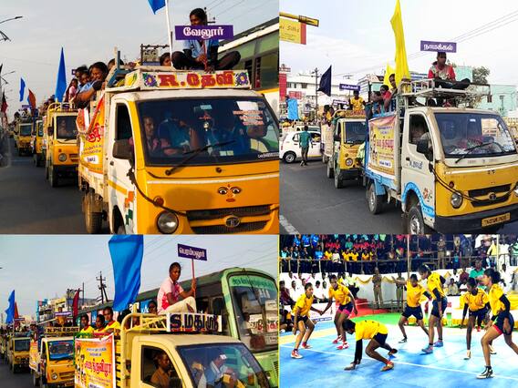 மேலும், ஆடு, மாடுகளை ஏற்றிச் செல்வதைப்போல, டாடா ஏசி வாகனத்தில் கபடி வீரர்களை பேரணியாக அழைத்துச் சென்றதால் பரபரப்பு.