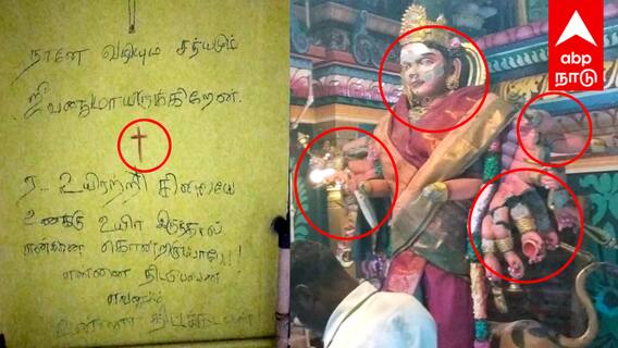 மேலும் அருகில் இருந்த 8 கைகள் உள்ள துர்க்கை அம்மன் கல் சிலைகளை உடைத்து கைகள் எல்லாத்தையும் உடைத்து விட்டு ரத்தத்தில் சிலுவையை வரைந்து பேப்பரில் எழுதி வைத்துவிட்டு சென்று உள்ளார்கள்.