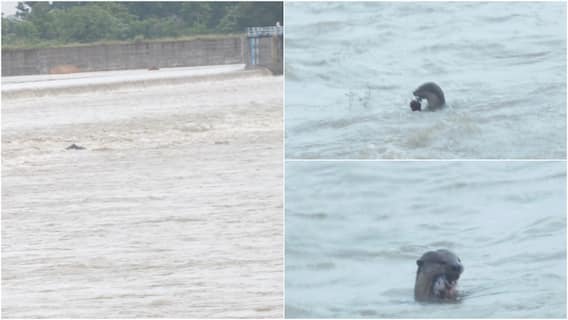 வடகிழக்கு பருவமழை பெய்து வருவதால் சாத்தனூர் அணையில் முழு கொள்ளளவு நிரம்பியுள்ளது. இதனால் சாத்தனூர் அணையிலிருந்து உபரி நீர் வெளியேற்றப்பட்டு வருவதால் தென்பெண்னை ஆற்றில் வெள்ளப் பெருக்கு ஏற்பட்டுள்ளது. வெள்ளப்பெருக்கு காரணமாக விழுப்புரம் அருகேயுள்ள ஏனாதிமங்கலம் எல்லிச்சத்திரம் அணைகட்டு பகுதியில் இருகரைகளையும் வெள்ள நீர் அர்பரித்து செல்கின்றன. வெள்ள நீர் செல்வதை கிராம பொதுமக்கள் பார்வையிட்டு செல்பி எடுத்து செல்கின்றனர். இந்நிலையில் எல்லிச்சத்திரம் அணைக்கட்டு பகுதியில் நீர் நாய் ஒன்று துள்ளி விளையாடு கொண்டு இருந்ததோடு மட்டுமல்லாமல் நீரில் மூழ்கி மீனை பிடித்து உட்கொண்டது நீர் நாய் மீனை பிடித்து உட்கொண்ட காட்சிகள் அங்கிருந்தவர்களுக்கு விருந்தாக அமைந்தது.