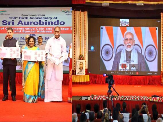 மகான் அரவிந்தரின் 150வது பிறந்த நாள் விழாவை முன்னிட்டு அவரது தபால் தலை வெளியீடு, அரவிந்தரின் உருவம் பொறித்த ரூ.150 நாணயம் வெளியீட்டு விழா புதுச்சேரி கம்பன் கலையரங்கில் நேற்று மாலை நடந்தது. விழாவிற்கு மத்திய மந்திரி கிஷண் ரெட்டி தலைமை தாங்கினார். தமிழக ஆளுநர் ஆர்.என். ரவி, புதுச்சேரி ஆளுநர் தமிழிசை ஆகியோர் முன்னிலை வகித்தனர். விழாவில் காணொலி காட்சி மூலமாக தபால் தலையை வெளியிட்டு, அரவிந்தரின் உருவம் பொறித்த நாணயத்தை வெளியிட்டு பிரதமர் மோடி பேசினார்.