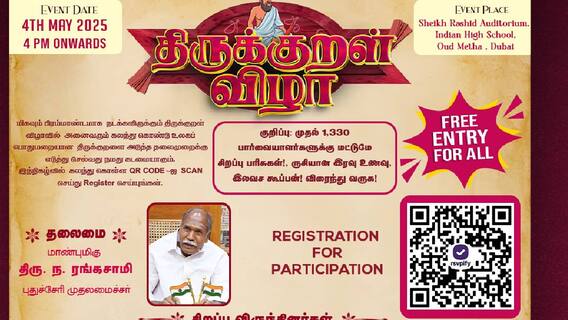 ஸ்கைப்ளூ மற்றும் டத்தோ மனிகண்டமூர்த்தி வேலாயுதம் வழங்கும் திருக்குறள் விழா துபாயில் நடைபெற உள்ளது. இந்நிகழ்ச்சி வரும் மே 4ஆம் தேதி மாலை 4 மணிக்கு நடைபெற உள்ளது.