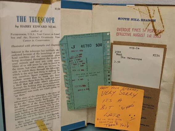 1971ஆம் ஆண்டு, ஏப்ரல் 20ஆம் தேதியே வந்துசேர வேண்டிய ’த டெலஸ்கோப்’ எனும் இந்தப் புத்தகம், தற்போது, “கொஞ்சம் தாமதாகிவிட்டது மன்னியுங்கள், 51 ஆண்டுகள் ஆனாலும் இந்தப் புத்தகம் நல்லபடியாக உள்ளது. நன்றி” எனும் குறிப்புடன் பெயர் கூற விரும்பாத நபரால் திருப்பி அனுப்பப்பட்டுள்ளது.