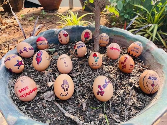 ராணுவ ஆட்சியை எதிர்த்து மியான்மரில் மக்கள் கொட்டும் மழையையும் பொறுப்படுத்தாமல் போராடிவருகின்றனர். அவ்வாறு போராடும் மக்கள் மீதும் அந்நாட்டு ராணுவம் தாக்குதல்களை நடத்திவருகிறது. இந்நிலையில் கடந்த ஞாயிற்றுகிழமை ஈஸ்டர் பண்டிகை கொண்டாடப்பட்ட நிலையில், ஈஸ்டர் முட்டைகளில் தங்களது ராணுவத்தை எதிர்த்து வாசகங்களை எழுதி மக்கள் போராட்டத்தில் ஈடுபட்டனர்.