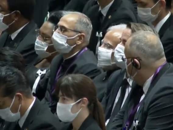 இதன்படி இன்று நடைபெற்றுக்கொண்டிருக்கும் ஷின்சோ அபே நினைவு சடங்கில் பிரதமர் நரேந்திர மோடி பங்கேற்கும் விடியோ வெளியாகியுள்ளது. இதற்காக அவர் நேற்று இரவே டோக்கியோவுக்கு புறப்பட்டுச் சென்றார். இந்நிகழ்வில் மோடியோடு சேர்த்து சுமார் 100 நாடுகளின் பிரதிநிதிகள் பங்கேற்றுள்ளனர். இந்த நிகழ்வில் கலந்துகொண்டுள்ள வீடியோவில் பல நாடுகளின் பிரதிநிதிகளுக்கு மத்தியில் பிரதமர் மோடி அமர்ந்துள்ளார். அவர் மட்டுமின்றி அங்கு இருப்பவர்கள் அனைவரும் மாஸ்க் இட்டு அமர்ந்துள்ளதை வீடியோவில் காண முடிகிறது. மேலும் சிலர் பிரதமர் இந்தியாவில் மாஸ்க் போடுவதில்லை என்று விமர்சனமும் செய்துள்ளனர்.