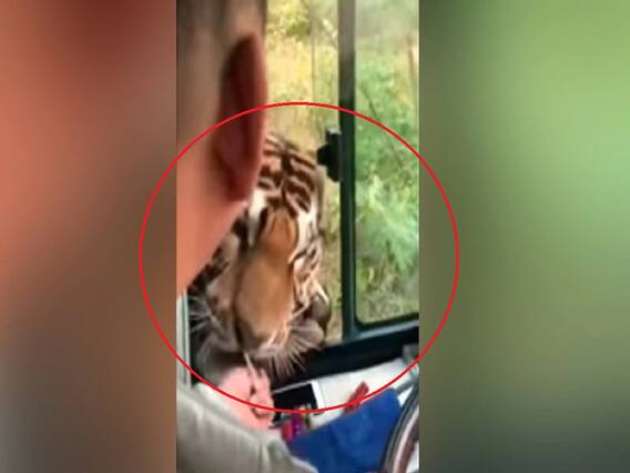 பேருந்தில் அமர்ந்திருக்கும் ஓட்டுநர் ஒருவர், பேருந்தின் ஜன்னல்களை திறந்து, இறைச்சியை குச்சியில் தொடங்கவிட்டபடி, மரத்திற்கு அருகே உலாவி கொண்டிருந்த ஒரு புலியை அழைக்கிறார்.