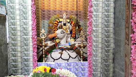 அதே போல் அம்மன் வீற்றிருக்கும் வாகனமான அன்னபட்சி முழுவதும் நவதானியங்களால் அலங்கரிக்கப்பட்டுள்ளது. இந்த கோவிலில் அலங்கரிக்கப்பட்டுள்ள அனைத்து பணங்களும் பக்தர்கள் அளித்த பணமாகும். நாளை இந்த பணங்கள் அனைத்தும் அந்தந்த பக்தர்களுக்கு பூஜை செய்து பிரசாதங்களுடன் அளிக்கப்படும் என கோவில் நிர்வாகிகள் தெரிவித்துள்ளனர். ஆடி கடைசி வெள்ளிக்கிழமை என்பதால் ஏராளமான பக்தர்கள் கோவிலுக்கு வந்து வழிபாடு நடத்திச் சென்றனர்.