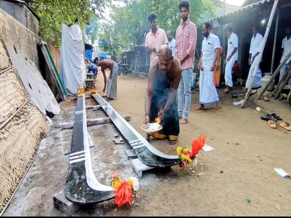 சிவகங்கை மாவட்டம் சிங்கம்புணரியில் இரும்பு தளவாடங்கள் செய்யும் தொழிற்பட்டறைகள் செயல்பட்டு வரும் நிலையில் இங்கு மதுரை மாவட்டம் அழகர்கோyiல் பதினெட்டாம்படி கருப்பணசாமிக்கு நேர்த்தி கடன் செலுத்துவதற்காக 450 கிலோ எடை கொண்ட 18.5 அடி உயரம் உள்ள அரிவாள் செய்யும் பணி கொடுக்கப்பட்டது.இதற்காக தொழிலாளர்கள் காப்பு கட்டி, விரதம் இருந்து பயபக்தியுடன் 15 நாட்களாக பணி செய்து பிரமாண்ட அரிவாளை தயார் செய்து முடித்தனர். அந்த அரிவாள் பக்தர்களிடம் ஒப்படைக்கப்பட்ட நிலையில், அதற்கு சிறப்பு பூஜைகள் செய்து அழகர்கோயில் பதினெட்டாம்படி கருப்பணசாமி கோயிலுக்கு எடுத்து செல்லப்பட்டது.