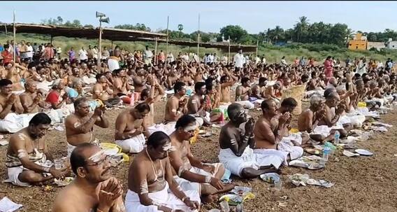 பக்தர்கள் வைகை ஆற்றில் வரிசையாக அமர்ந்து வழிபாடு