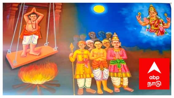 இதனையடுத்து அபிராமி பட்டர் எரியும் நெருப்பிற்கு மேலே ஊஞ்சல் அமைத்து அபிராமி அம்மனை நினைத்து அபிராமி அந்தாதியை பாடினார். 100 கயிறுகள் கொண்ட ஊஞ்சலில் ஒவ்வொரு பாடலுக்கும் ஒரு கயிறாக அறுத்துக்கொண்டு வரும்போது 79 வது பாடலான