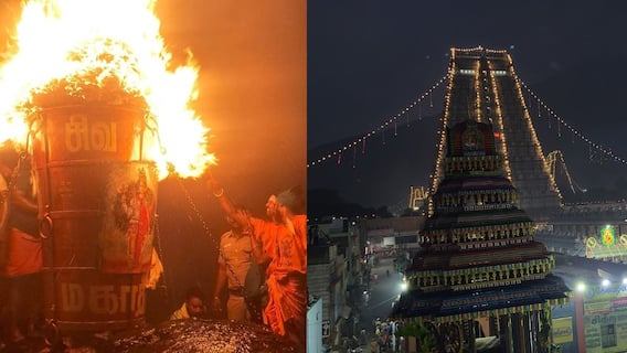 Tiruvannamalai Maha Deepam 2024: கார்த்திகை தீபத் திருவிழாவையொட்டி திருவண்ணாமலையில் 2,668 அடி உயரமுள்ள மலையின் உச்சியில் இன்று மாலை 6 மணிக்கு மகா தீபம் ஏற்றப்பட்டது. ஜோதி வடிவமாக அண்ணாமலையார் காட்சியளிக்கிறார். முன்னதாக மலை அடிவாரத்தில், அண்ணாமலையார் ஆனந்த தாண்டவம் ஆடி பக்தர்களுக்கு காட்சியளித்ததை தொடர்ந்து, கீழே தீபம் ஏற்றப்பட்டது.