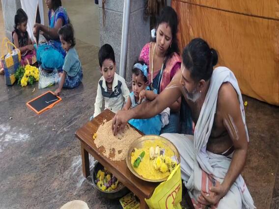விஜயதசமி விழாவை ஒட்டி காஞ்சிபுரம் ஹயக்ரீவர் கோயிலில் நெல்லில் உயிர் எழுத்தான அ எழுதி தங்கள் குழந்தைகளுக்கு கல்வியை துவக்கிய பெற்றோர்கள்