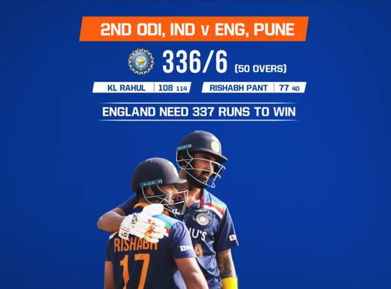 அதன்பிறகு, களமிறங்கிய தொடக்கம் முதலே அதிரடியாக ஆடினார். இதனிடையே, ராகுல் அரை சதம் அடித்தார். பின்னர், இருவரும் இங்கிலாந்து பந்துவீச்சாளர்களை துவம்சம் செய்தனர். பன்ட் 28 பந்துகளில் அரைசதம் அடித்து மிரளவைத்த சிறிது நேரத்தில், ராகுல் தனது 5-வது சதத்தை பதிவு செய்தார். 108 ரன்னில் ராகுல், 77 ரன்னில் பன்ட் ஆட்டமிழக்க, கடைசியில் பாண்ட்யா சகோதரர்கள் பட்டையை கிளப்ப, 50 ஓவர் முடிவில் இந்தியா 6 விக்கெட் இழப்புக்கு 336 ரன்கள் குவித்தது.