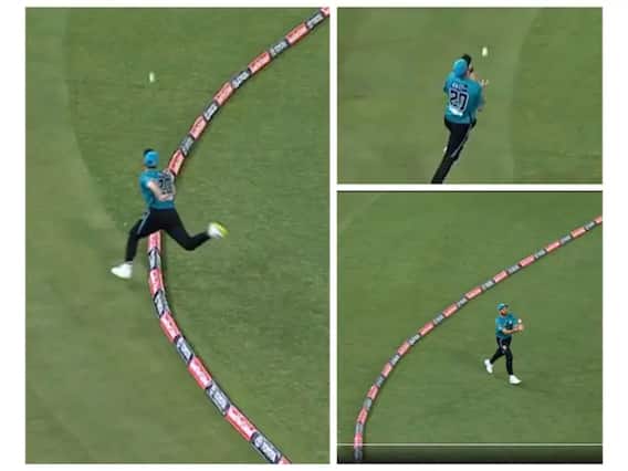 மைதானத்திற்கு வெளியே சென்ற அவர், பந்தை மீண்டும் ஒருமுறை மேலே தள்ளிவிட்டு எல்லை கோட்டிற்குள் வந்து கேட்ச் செய்தார்.