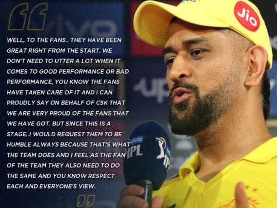 போட்டிக்கு பின்னர் சென்னை சூப்பர் கிங்ஸ் அணியின் கேப்டன் தோனி பேசியபோது, சிஎஸ்கே ரசிகர்கள் குறித்து கேட்டனர். அதற்கு பதிலளித்த பேசிய தோனி, “ரசிகர்கள் தொடக்கத்தில் இருந்தே சிறப்பாக இருந்தனர். நல்ல பெர்ஃபாமென்ஸ் அல்லது மோசமான பெர்ஃபாமென்ஸ் என்று வரும்போது நாங்கள் அதிகம் சொல்லத் தேவையில்லை, ரசிகர்கள் அதை கவனித்துள்ளனர் என்பது உங்களுக்குத் தெரியும். எங்களுக்கு கிடைத்த ரசிகர்களைப் பற்றி நாங்கள் மிகவும் பெருமைப்படுகிறோம் என்று சிஎஸ்கே சார்பாக நான் பெருமையுடன் சொல்ல முடியும். ஆனால் இது ஒரு கட்டம் என்பதால், அவர்கள் எப்பொழுதும் தாழ்மையுடன் இருக்க வேண்டும் என்று நான் கேட்டுக் கொள்கிறேன். ஏனென்றால் அந்த அணி என்ன செய்கிறது, அணியின் ரசிகனாக நான் உணர்கிறேன். அவர்களும் அதையே செய்ய வேண்டும். மேலும் ஒவ்வொருவரின் பார்வையையும் மதிக்கிறீர்கள் என்பது உங்களுக்குத் தெரியும்” என்று பேசினார்.