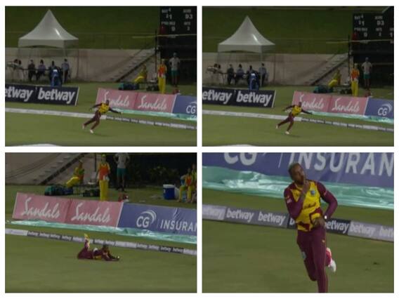 இதன்பின்னர் கேப்டன் ஃபின்ச் மற்றும் மிட்சல் மார்ஷ் ஆகியோர் அதிரடி காட்டினர். மார்ஷ் 30 ரன்களுடன் ஆட்டமிழந்தார். அதன்பின்பு அதிரடி காட்டி வந்த கேப்டன் ஃபின்ச் 10ஆவது ஓவரில் ஹேய்டன் வால்ஷ் பந்தை சிக்சருக்கு விரட்ட முற்பட்டார். அப்போது பந்தை லாங் ஆன் திசையில் ஃபில்டிங் செய்து கொண்டிருந்த ஃபேபியன் அலென் பிடிக்க ஓடி வந்தார். பந்தை தன்னைவிட சற்று தூரமாக இருப்பதை அறிந்த அவர் தன்னுடைய இடது கையை மட்டுமே நீட்டி சிறப்பாக பந்தை பிடித்து அசத்தினார். இந்த கேட்ச் பார்ப்பதற்கு மிகவும் அசத்தலாக அமைந்தது.