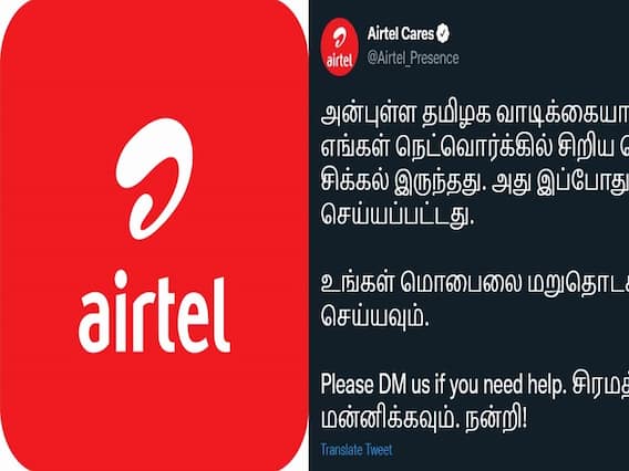 இது குறித்து ஏர்டெல் வெளியிட்டுள்ள பதிவில், ”அன்புள்ள தமிழக வாடிக்கையாளர்களே. எங்கள் நெட்வொர்க்கில் சிறிய தொழில்நுட்ப சிக்கல் இருந்தது. அது இப்போது சரி செய்யப்பட்டது. உங்கள் மொபைலை மறுதொடக்கம் செய்யவும். Please DM us if you need help. சிரமத்திற்கு மன்னிக்கவும். நன்றி!” என தெரிவித்திருக்கிறது.