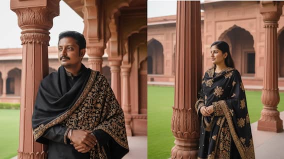 ப்ராம்ப்ட்டை "Create a highly realistic portrait of a young woman standing near a historic red sandstone pillar. She is looking sideways with a calm, thoughtful expression. The woman is wearing a traditional black outfit with a dark shawl draped over her shoulders, decorated with intricate golden and earthy embroidered patterns.