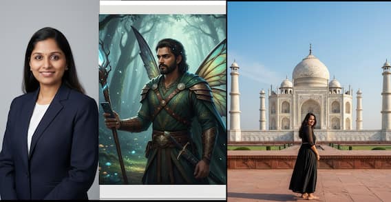 Prompt: “Place a person into famous world destinations like the Eiffel Tower, Taj Mahal, or Santorini beaches. Add realistic shadows, lighting, and perspective to make it look like an actual travel photo.”
